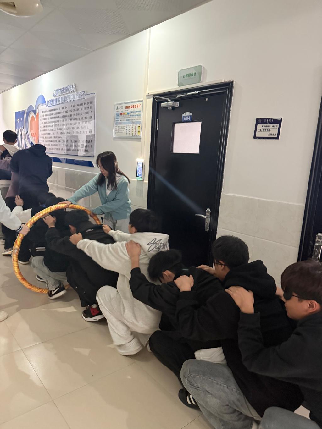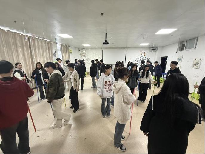 团体心理辅导体验从“破冰”开启,通过“数字报团”快速打破隔阂,再经“团队建设”、“森林盲杖”、“翻牌”环节,帮助同学们快速熟悉彼此、建立团队联结。此次团体心理辅导体验中最具挑战性,也最考验默契的团队协作项目是“蒙眼障碍赛”。队员佩戴眼罩,在队长引导下经过指压板、呼啦圈、泡沫砖等障碍,四组同学既各自为战又相互鼓劲,在共克难关中真切体会到信任与协作的力量。