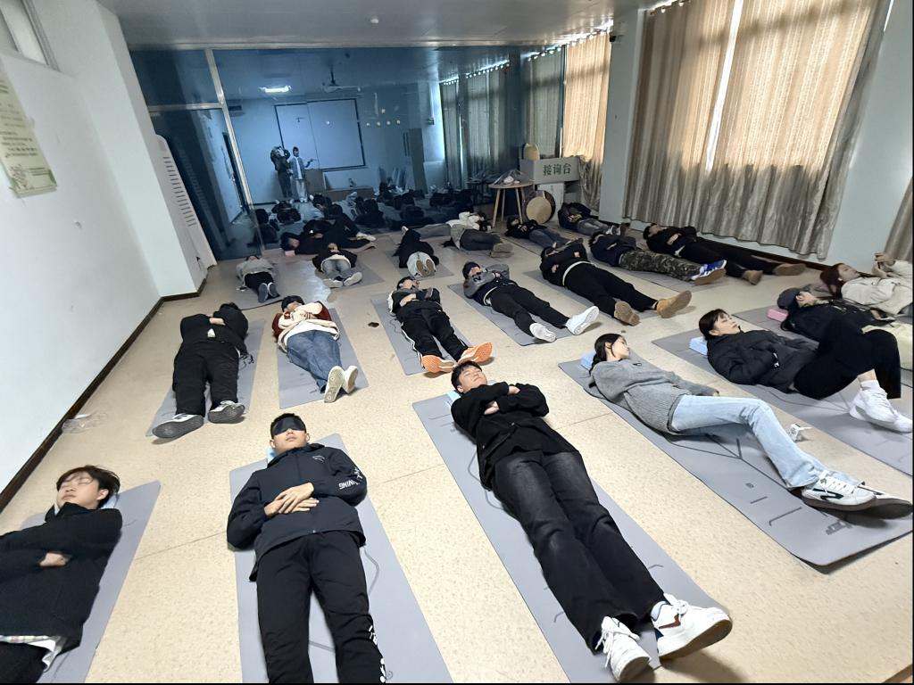 沙盘体验中,小组同学依次进入沙盘空间选择物品摆放,共同完成风格迥异的沙盘作品,在协作中学会清晰表达想法、尊重他人创意。冥想体验环节,同学们跟随引导语放松身心,在喧嚣中寻得内心宁静,两组交换体验更感受了不同引导风格的心灵疗愈。